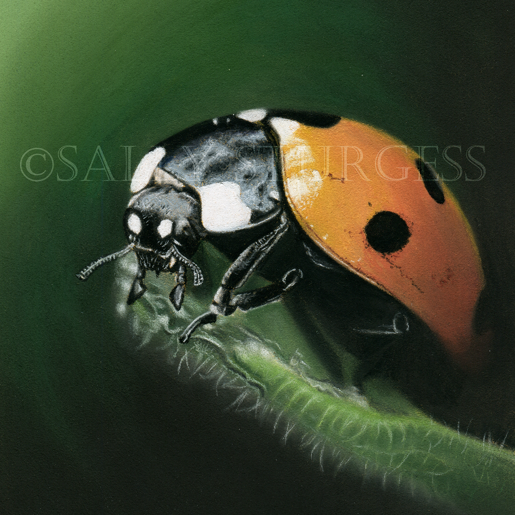 “Ladybird on Snowdrop” – 6×6″ original pastel painting on archival paper, supplied mounted and ready to frame – £95